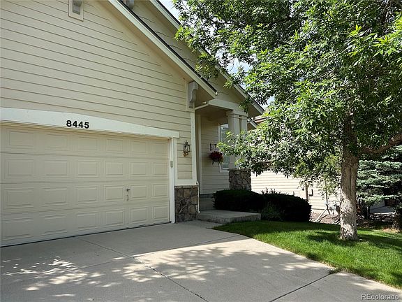 Welcome to your dream home at 8445 Brambleridge Drive in the vibrant community of Castle Pines, CO. This stunning property has it all - 4 bedrooms, 4 full bathrooms, and a spacious 2-car garage. This wonderful ranch style patio home offers a low maintenance life style with snow removal, lawn care, and easy pool access. Step into this open concept floor plan and let your imagination run wild. With its light wood floors, vaulted ceilings, and cozy gas fireplace, these rooms are perfect for creating your own unique space. The primary bedroom is a cozy retreat with a five piece connected bathroom. The spare rooms are waiting for your personal touch - whether you need a home office, a creative space, or a guest room. The kitchen is a chef's delight, featuring stainless steel appliances, quartz countertops, a tasteful backsplash, and light cabinetry waiting for you to put your special touches on. The kitchen includes a Bosch refrigerator and a Miele dishwasher. Step outside into the backyard and imagine yourself sipping a cup of coffee or hosting a barbecue on the deck. The spacious deck is perfect for outdoor activities and enjoying the Colorado sunshine. Enjoy the amazing bonus spaces offered in this home, the lower level offers a large family/media room, two additional bedrooms, one of which can function as a second primary bedroom, and two bathrooms featuring Hans Grohe fixtures. The two car garage features abundant storage, a tesla car charger and incredible overhead room. New roof November 2023.