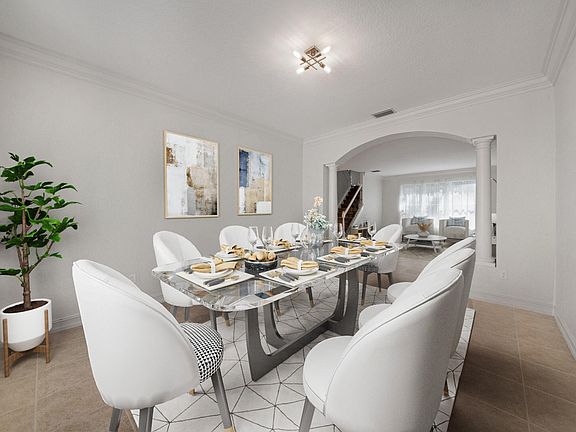 Welcome to this beautifully appointed 5-bedroom, 4-bathroom residence located in the highly sought-after community of Canyon Isles. This elegant home offers the perfect blend of sophistication and comfort. Step inside to find a formal living room and formal dining room, ideal for entertaining, as well as a spacious family room featuring impact-rated French doors that fill the space with natural light. A stylish wrought iron staircase leads to a versatile loft area, perfect for a home office or playroom. Neutral flooring, crown molding, and a central vacuum system add refined touches throughout. The heart of the home is the updated kitchen, featuring classic white cabinetry, stunning quartz countertops, tile backsplash, under-cabinet lighting, a double wall oven, pot and pan drawers, a broom sweep vent, and both a breakfast area and snack bar for casual dining.