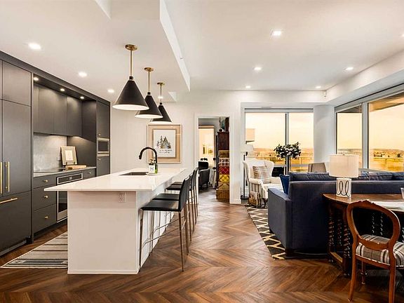 Experience elevated urban living in this warm and inviting two-bedroom residence offering over 1,100 square feet of thoughtfully designed interior space and a wraparound terrace perfect for everyday outdoor living and relaxed entertaining. Blending a cozy Ralph Lauren–inspired aesthetic with modern finishes, this home features chevron-patterned flooring, designer lighting, and flat-painted ceilings that create a timeless atmosphere throughout. The chef-inspired kitchen is the heart of the home, showcasing matte grey slate cabinetry with soft-close hardware, brushed-gold accents, quartz countertops, and a matching backsplash. Premium appliances include a Frigidaire induction cooktop, Elica hood fan, Fisher & Paykel integrated fridge and freezer, and Whirlpool oven, complemented by a deep grey Blanco sink, elegant black pendant lighting, and a spacious walk-in pantry. The open living room and dining areas are bathed in natural light from expansive windows that frame stunning mountain views, while a charming reading/coffee nook offers the perfect spot to unwind or start your day. The versatile second bedroom can easily serve as a guest room, home office, or creative space, complete with a walk-in closet and a stylish four-piece bathroom. The primary suite feels calm and comforting, with warm neutral tones, a walk-in closet, and a spa-like ensuite featuring dual vanities, quartz countertops, and a glass-enclosed shower. Additional features include a new Electrolux washer and dryer, generous linen storage, one titled underground parking stall, and two large storage units. The wraparound terrace enhances daily living with ample space for outdoor lounging and garden greenery, creating a private retreat in the heart of the city. Residents enjoy access to premium amenities including a rooftop patio, private owner’s lounge, secure underground visitor parking, bike storage, EV charging stations, and concierge services. Ideally located in Calgary’s West District, you are surrounded by parks, walking paths, boutique shops, cafés, and dining options. Book your private viewing today!