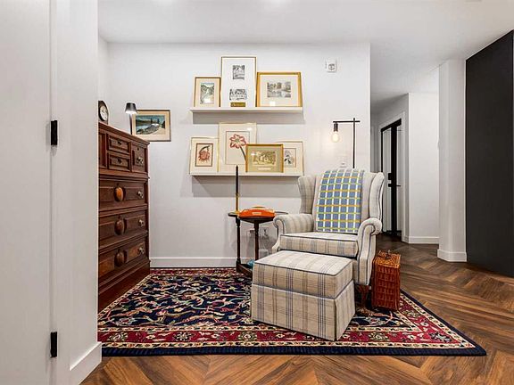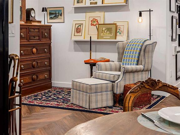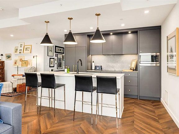 Two-bedroom residenceChevron-patterned flooringFlat-painted ceilingsChef-inspired kitchenBrushed-gold accentsQuartz countertopsMatching backsplash