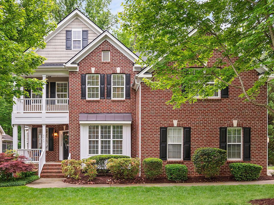 Welcome to 8445 Eden Park Drive, a stunning 4-bedroom home located in a pool community in Northwest Raleigh neighborhood, Ashworth Estates. This home has a thoughtful floor plan with providing ample living spaces. Step inside to the inviting foyer and staircase. First floor dedicated office and formal dining area. Discover a bright updated kitchen with Carrara marble subway tile, professionally painted cabinets, quartz countertop, walk-in pantry, under-cabinet lighting and breakfast area open to family room. Outside you will find private wooded view from the extra large deck, natural gas line for grill, and stone patio perfect for entertaining friends and family. Second floor hosts spacious bonus room providing extra space for movies or games. Expansive primary bedroom suite complete with two generously sized walk-in closets. Primary bath with jetted tub and separate vanities. 2-car side entry garage. Updates include: Carpet replaced 2024, Roof 2022, Water heater 2017, Exterior lighting 2023, Exterior trim and deck stained 2024. Convenient to Brier Creek, RTP, I-540 with numerous shopping and dining options. Open house Friday, May 10 from 5-7pm, and Saturday, May 11 from 12-3pm.