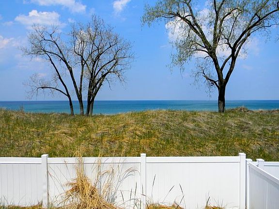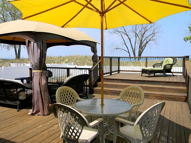 Lake front property in charming Miller Beach, this 2 bedroom / 1.75 bath offers the best of all year beach life just 1 hour away from Chicago. Hardwood floors throughout the main floor of the house, Kitchen with ceramic flooring is fully equipped and has lots of cabinets and counter space. L-shaped living room/dining room opens to the expansive multi-layer deck through 2 sets of sliding glass doors. Deck (2008) has been professionally stained. All new windows installed in 2008. PVC fence surrounds the maintenance free landscaping. Two nice size bedrooms with deep closets and the main floor bath was updated in 2008. The clean, dry basement offers more recreational space, and laundry facilities. Just out your gate is the best beach for year round recreation. Beach life amenities include shade tent on deck, outdoor hot/cold faucets, under deck storage, and outdoor electrical. See the Chicago Skyline from your beachfront home !