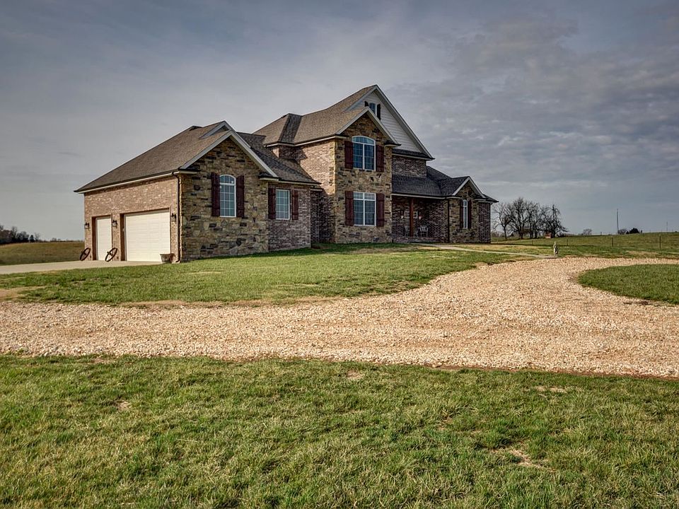 Long drive to the like new home on 60 acres with hill top views of the land and pond. Land is cleared and fenced. Home was custom built 2016 and is loaded with upgrades. See list in documents . With 5 bedrooms and 2 offices there is plenty of room. All rooms are nice sized. Jack-n-Jill bathroom for the 2 upstairs bedrooms. Open floor plan with over sized windows for lots of natural light and views. Covered deck is over 330 sq ft provides extra living area. Master suite has walk-in shower 2 large closets with built-ins and much more. Kitchen has large hidden pantry, pot filler, indirect lighting. Office or formal dining room is off of entry. Family room in basement has wet bar and access to the patio. Easy access to Joplin or Springfield. Mt Vernon School. Floor plan attached