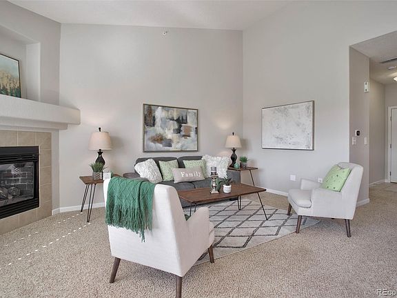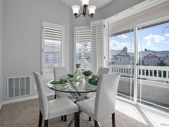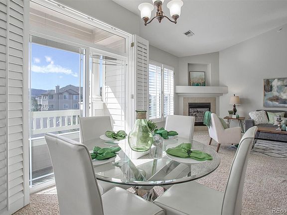 Elevated elegance is showcased in this beautifully updated top-level, 2 bed, 2 bath, end unit offering 1262 sq ft of living space, plus an inviting outdoor covered balcony that displays stunning mountain and sunset views to the west. Upon entrance, you are greeted with a freshly painted open-concept great room with vaulted ceilings, and large windows adorned with white plantation shutters that flood the space with natural light. A cozy gas log fireplace will warm you on chilly winter nights. Entertaining friends and family will be a breeze in the adjacent dining room & brand-new kitchen with slate gray cabinets, white quartz countertops, and new stainless steel appliances. Retreat to the impressive primary suite with windows that frame the lovely western views and a newly updated ensuite primary bath with dual vanities and a large walk-in closet. An additional updated 3/4 bathroom and a light-filled second bedroom are thoughtfully positioned on the opposite side of the condo providing cherished privacy between the rooms. An in-unit laundry room with storage completes the space. This unit includes a detached 1-Car garage with extra storage and plenty of open parking. The Redstone Ridge community offers a nice clubhouse, fitness room, pool, hot tub, and paved walking trails. Enjoy close proximity to Chatfield Reservoir, shopping, and dining amenities with easy access to C-470. Don't miss your chance to call this impressive domain home.