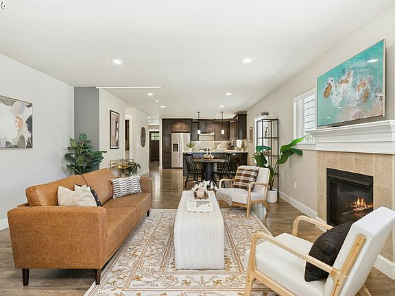 Quality and character shine in this beautifully maintained, single-level home. Perfect for entertaining, the open-concept floor plan-- featuring engineered wood flooring and gas fireplace-- provides a cosy place to gather with friends and family. French doors from the living area open to a charming covered patio and your own private garden retreat. Fully fenced backyard is ready for kiddos, pups or sanctuary. The home chef will love the upgraded gas range w dual convection oven and vented hood, plus herbs growing from planter boxes just steps away on the covered front porch. Quartz counters and all stainless steel appliances provide a quality touch. Spacious primary ensuite includes generous walk-in closet and bath, while versatile 3rd bedroom makes an ideal home office or den. All appliances stay, including W/D and mounted Smart TV. Set on a quiet, non-through street, yet minutes from abundant amenities-- including shopping, dining, MAX line, parks and the 21-mile Springwater Trail-- this Happy Valley gem blends comfort, style and convenience.