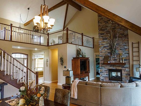 This one is a rare Lake Home find! STUNNINGLY BEAUTIFUL inside and the grounds are impeccable, lush landscape, pavers, firepit. Custom built! Geothermal heat, birch wood floors, private lake for peace and true relaxation equals family/friend fun!! This home is warm and very welcoming, ideal for entertaining on every level of this home. Lighthouse stays. Loft area could be additional bedrooms, if needed. The guesthouse above the garage is heated and cooled. No details were missed when this gem of a home was custom built.