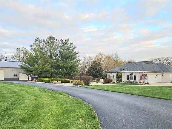 Tranquil living w/in minutes of everything. This stately 3-bedroom, full brick ranch on 4 acres is awaiting its new owners. Porcelain plank tile throughout the main level. Custom cabinetry, extended island w/a chef's kitchen, remote blinds & an incredible view of the water from almost every room w/out the maintenance. Primary ensuite is very spacious, w/ two walk-in closets. Stunning stone bathroom. Private French doors to the patio adds allure. Additional bedroom is equipped w/roll in shower, stone tile & is ADA friendly. Entire home is compliant w/ 3ft wide doors. Dual HVAC. On demand generator - restores power w/in 60 seconds. Anderson windows. Full unfinished lower level awaits your touches on this beautiful home. Safe room in basement. Partially fenced. Yard has been impeccably maintained. 48 x 60 Metal outbuilding newly reskinned. Includes 10 ft & 12 ft doors, office, bathroom & wide-open space to store all of the toys. 18-foot ceilings offering the opportunity to build up!