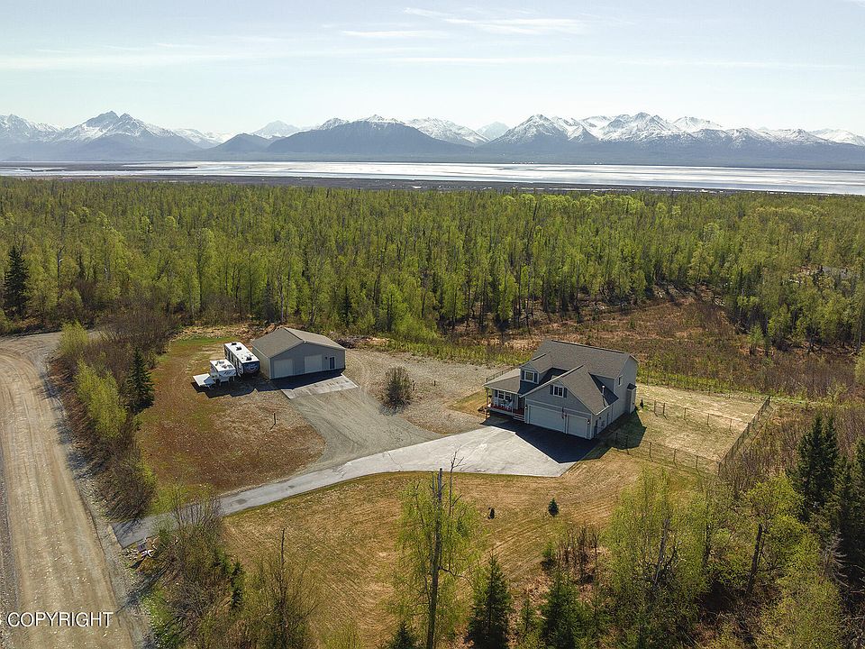 Meticulously Kept Custom-Built Home on 5 Acres w/ 40x30 Detached Shop/Garage! Home Boasts Stunning Kitchen w/Shiplap Ceiling, Jenn-Air 4-Brnr Gas Cooktop, Dbl Ovens, 42'' Cabs, Granite Counters, Large Island, Farm Sink. BUTLERS PANTRY Behind Kitchen! 1200 SF Detached Shop/Garage Fully Insulated, Gas Heater, Plumbed for Toilet/Sink. 900 SF Attached 3-Car Garage. RV/Boat Parking. Beautifully LandscAdditional Home Features: *Five Star Energy Rating *Built by Precision Homes, one of Alaska's FINEST Home Builders *9' Main Level Ceilings *Bamboo Flooring Main Level *HRV System *Navien Energy Efficient Water Heater *Pressure Tank *Whole House Water Filtration System *NO HOA! *Fenced Area in Back (not entire yard fenced!) Main Level Features: *18' Grand Entry *Custom Staircase w/Carpeted Treads on Wood; Wrought Iron/Wood Railing *Office/Bedroom Room off Entry w/Closet *Powder Room w/Tiled Floor, Pedestal Sink, Antique Style Mirror, *Laundry/Mud Room off Garage w/Wainscoting, Tiled Floor, Storage *Open Kitchen/Dining/Family Room Concept- FR w/"Heat & Glo" Cast Iron Gas FP w/Blower, Battery Back-Up, Tiled Surround, Custom Mantle; Electric Shades *Eat-In Dining Area w/French Doors to Back Deck *Kitchen Details: All Stainless Steel Appliances- Jenn-Air 4- Burner Gas Cooktop w/Hood Vent, Samsung Dishwasher, Maytag Double Convection Oven, Samsung French Door Refrigerator, 42" Cream Colored Cabinets w/Soft Close Tabs (storage pull-out drawers, spice rack, lazy susan, pan storage, trash pull-out), Black Granite Counters, Porcelain Farm Sink *Butler's Pantry- Tiled Floor, 42" Cream Colored Cabinets wSoft Close Tabs (includes 3 large and deep corner cabinets for TONS of storage!), Quartz Counters, Microwave, Farm Sink, Stainless Steel Refrigerator *Formal Dining Room off Kitchen w/Sliding Doors to Back Deck Upper Level Features: *Primary Suite w/Coffered Ceiling, Ceiling Fan, Back of House Mountain Views, Walk-In Closets, Private Ensuite w/Clawfoot Soaker Tub, Floor to Ceiling White Tiled Walk-In Shower, Dual Sinks, Granite Counter, White Tiled Flooring, Separate Toilet Room *Bedrooms 2-3 w/Ample Closets *LARGE Bonus/Rec Room w/Large Storage Closet, Ceiling Fans *Full Bathroom w/Tub/Shower combo, Granite Counters, Wainscoting 900 SF Attached Garage: *Mandoor to Yard *Epoxy Flooring *220V *Heated *Utility Sink 1200 SF Detached Garage/Shop: *Electric all re-wired *Lighting Added *Insulated *Plumbed for Toilet/Sink *Main Shop w/ Modine Hot Dawg Heater *Side Room w/ Rinnai Heater *50 amp for Toy Hauler *30 amp for future electric gate (if new owner wants to add one!)