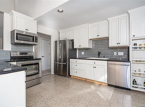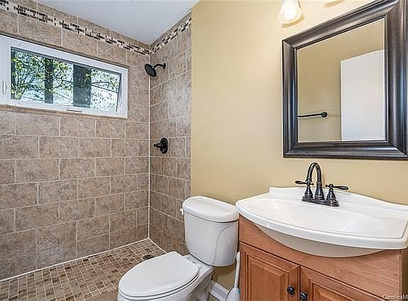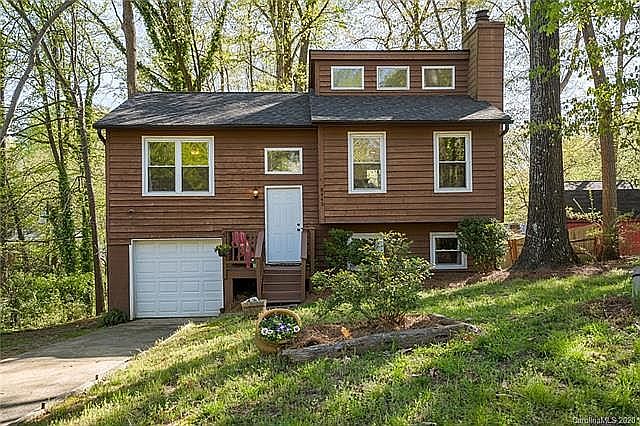 This home feels like it was picked up from the sunny southwest or California and dropped in Charlotte NC! Enter the split foyer entrance and come up to the main level to find a sun SOAKED bright open living area and kitchen. The stone fireplace is a handsome accent piece. The kitchen has been upgraded with slick black tile countertops, glass tile backsplash, new cabinets, and stainless steel appliances. The Deck off the breakfast area is a wonderful place to entertain and overlooks the awesome wooded yard and custom firepit with bench seating. The master bedroom just off the hallway has it's own private bath that has been updated with a gorgeous custom tile shower and new vanity. In the lower level you'll find two additional bedrooms, a full bathroom, garage access, a large laundry room and access to a lower covered patio under the deck.