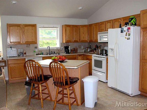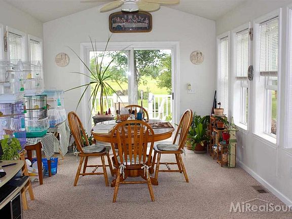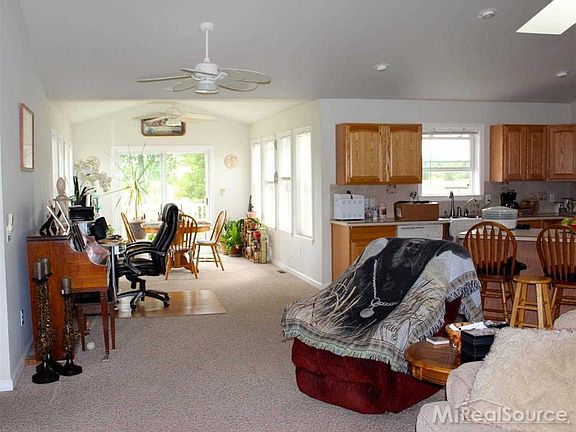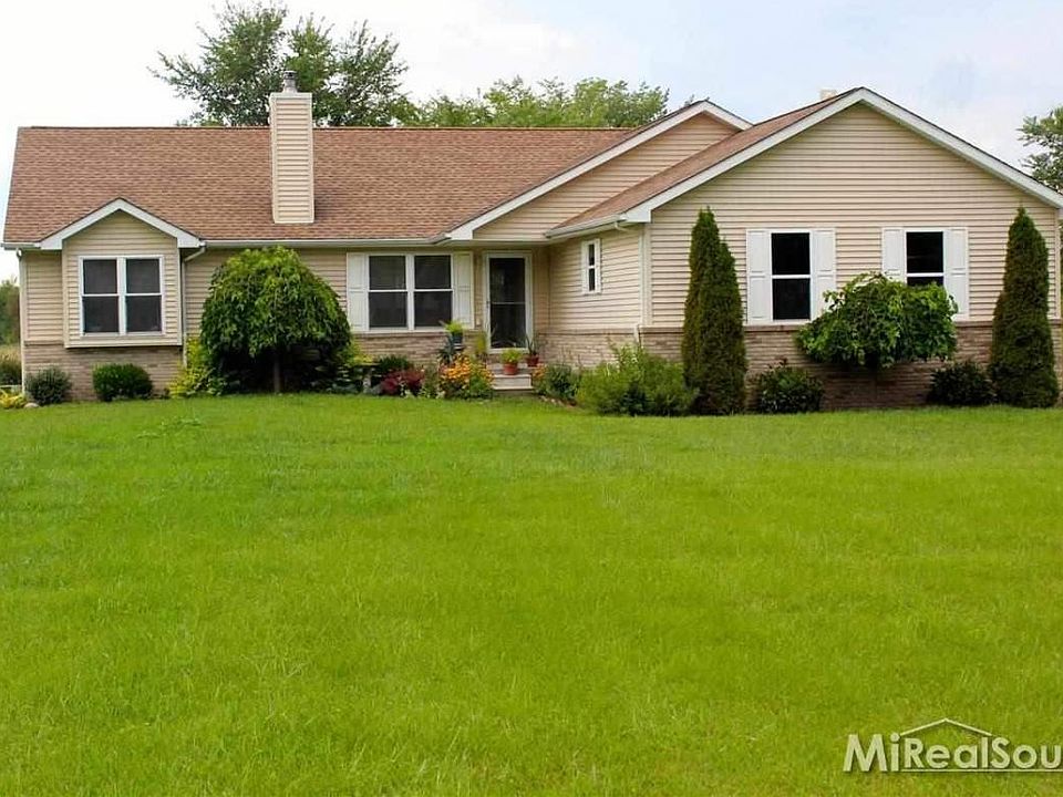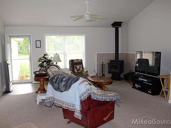 Sprawling split ranch on 5 acres w/ 3 bedrms & 2 full baths. Mstr w/ WIC & private bath. 2nd bedrm features WIC & window seat. Private backyard w/ a lrg pond stocked w/ koi, blue gill & catfish. Natural lighting w/ doorwall to deck. Daylight bsmnt w/14 ft ceilings, plumbed/prepped for bathrm & extra storage for canning. Wood burning stove & 3 compartment shed. 1st flr laundry/mud rm. Garage w/ work bench & tons of storage. All appls included except freezers. Exclude outhouse, portable greenhouse, goat pen.