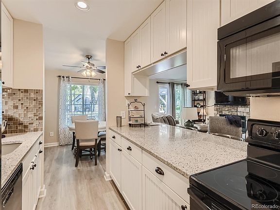 Rare find! This remodeled ranch style end unit will impress with its spacious and open floorplan. The vaulted ceilings and abundance of windows provides lots of natural light and warmth. The kitchen is complete with upgraded white cabinets featuring soft close drawers and slide out shelves, granite countertops and tile backsplash. Both bathrooms have also been updated with quality finishes. Other recent improvements include new Renewal by Andersen windows in 2021, new slider in 2020, new washer, dryer, luxury vinyl flooring, upgraded carpet and pad in 2019 and new furnace and A/C in 2023. There are too many improvements to name them all. The exterior is equally as nice with a sizable private fenced patio with pergola that sides to greenbelt - providing the perfect space to relax or entertain. Great value! Must see!
