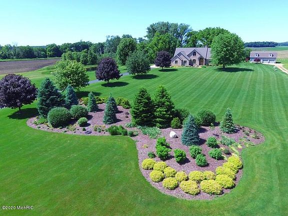 Own a piece of paradise in the heart of wine country less than 2 miles from Tabor Hill! Immaculate custom built brick home boasts a grand entrance with soaring ceilings and french doors leading to stunning views. Enjoy the pure privacy this 10 acre property with private fishing pond and creek has to offer. Spacious main floor master suite. Upper level adds 3 bed/1 bath while the w/o basement offers separate living space with 3 finished rooms, full bath and kitchenette. Unfinished heated loft space above the detached 48'x28' outbuilding could be finished. Great as a full time or 2nd home. 90 min. from Chicago and minutes from Harbor Country. Plan your escape today!