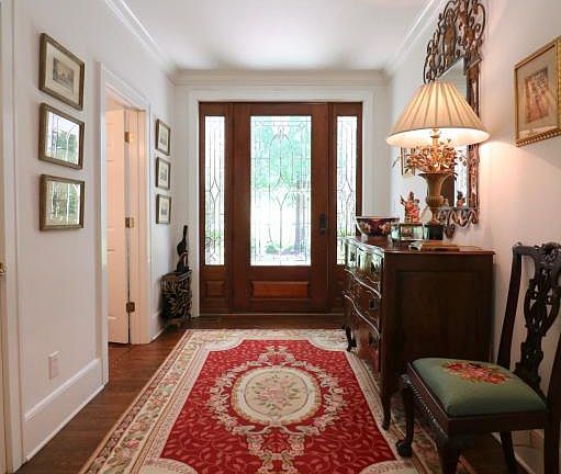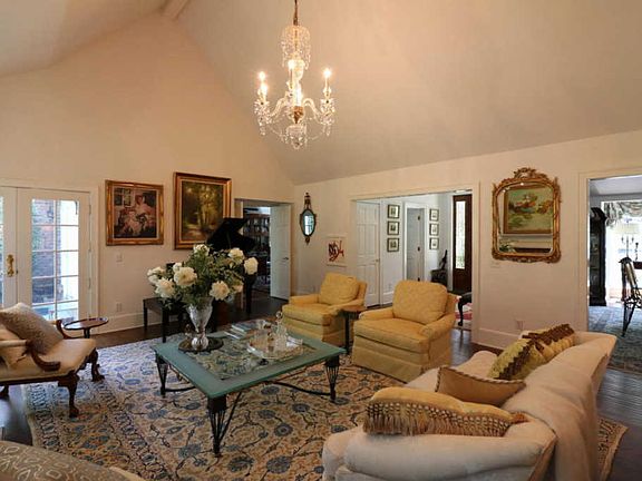The cobblestone driveway is guarded at the entrance by statues of the Lion and Unicorn supported by a brick wall. Wind your way up the circular driveway to the front of the home, and in the evening the indirect lighting on the driveway and surrounding the lovely home will guide you. Enjoy the lush and carefully planned landscaping surrounding the home that is nestled in the center of the 5.77 acres adding to the privacy enjoyed here. The slate walkway brings you to the entrance which opens to the 16' soaring ceilings of the living and dining rooms.