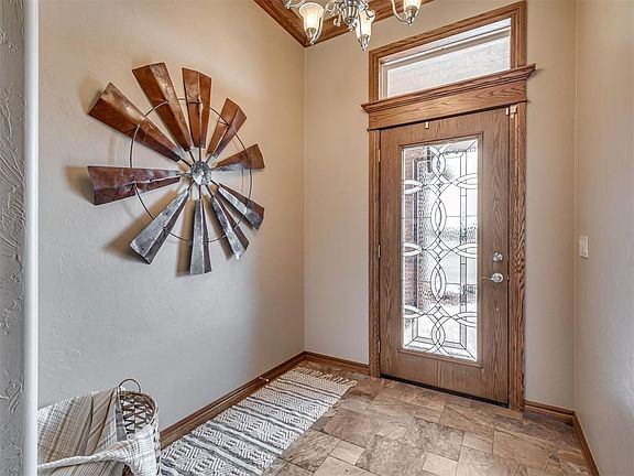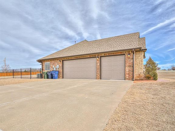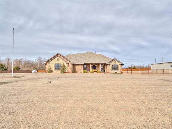 Welcome to your new home, small town feel with easy access to highways, Norman and OKC! This 3 bedroom home with a desirable split floorplan offers the perfect blend of comfort and space and the 2x6 construction and Class 4 roof adds peace of mind. Nestled on 2.27 acres of picturesque land, the property features a covered, stained concrete front porch leading into the beautiful home with a dedicated office with 2 built in desks, bookshelves and closet, leading to the large living room with stunning stone fireplace and views of the fenced backyard with room for a pool! The kitchen is a dream with extra cabinets, beautiful woodwork, large walk-in pantry, granite counters and breakfast bar. The master suite has high, tray ceilings, ensuite bath with extra large soaking tub, all tile walk in shower and spacious, custom walk in closet. Doing laundry is a breeze with the extra storage, hanging racks, sink and folding area, 2 spare bedrooms are separated by a jack n jill bath that each has their own separate vanity area, both have new carpet, walk in closets and built ins. Guest bath near the main areas is perfect for guests. Entertain on the oversized stained concrete patio overlooking spacious yard and 60x30 fully insulated shop with electrical and 2 overhead doors, property has 2 wells (both are plumbed to house and can be alternated with switch) and a 2nd septic so running plumbing to the shop is easy. The side entry 3 car garage and extra wide driveway adds plenty of room for parking your vehicles. With it's tranquil surroundings and modern amenities, this home is a comfortable retreat for those seeking the ultimate combination of serenity, space and convenience. Home is wired for a generator and has a safe room accessible from the garage for added protection. Don't miss the opportunity to make this delightful property your own! Schedule a showing today!