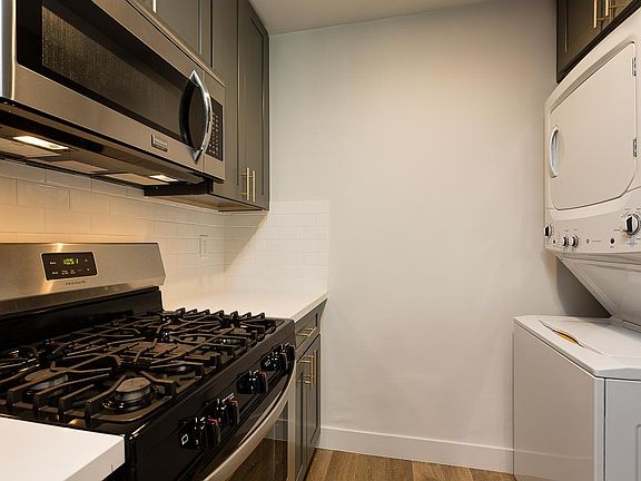 Crown moldingStainless steel appliancesAmple cabinet spaceRecessed lightingHardwood flooringWall ac unitIn-unit washer and dryer