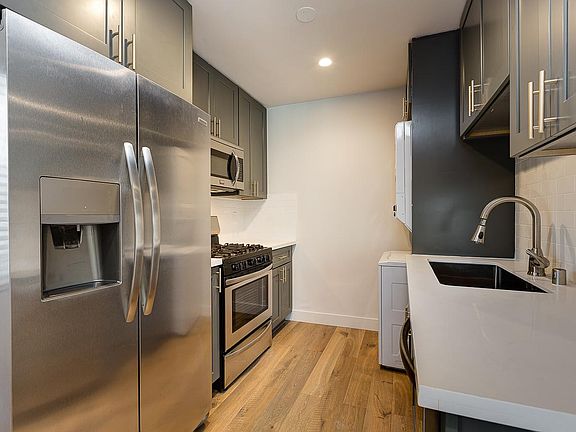 Gorgeous a one-bedroom, one-bathroom apartment available for rent. This apartment features hardwood flooring, crown molding, and recessed lighting throughout. The kitchen is equipped with a full set of stainless steel appliances, including a dishwasher, stove, refrigerator, and microwave, along with ample cabinet space. The unit also includes a wall AC unit in the living area and an in-unit washer and dryer.