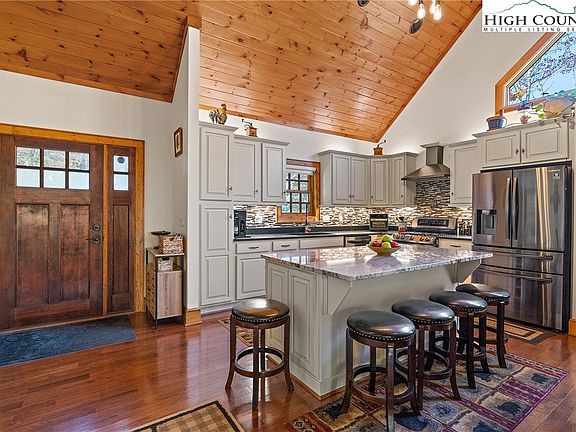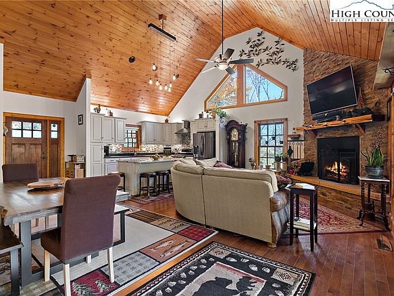 Introducing a unique custom home in the gated Silverleaf community, nestled on 3 acres alongside the South Fork Ellison Branch. Enjoy the tranquil sounds of the mountain stream from your back porch. This property offers single-level living with the primary bedroom and laundry on the main level. The ensuite bathroom features a spacious walk-in tile shower, granite counters, and heated tile floors. The primary bedroom connects seamlessly to the outdoors through large windows and a sliding glass door leading to the covered porch. Designed by the owners and constructed by renowned builder Tom Eggers, the open floor plan is perfect for entertaining. A great room with a soaring stone wood-burning fireplace, dining area, eat-in kitchen, and vaulted tongue and groove ceilings create an inviting space. Upstairs, you'll find an open loft suitable for a home office or extra guest sleeping quarters. The lower level offers two bedrooms, a full bath, workout room, two person infrared sauna, and a cozy den/game room with access to the lower porch. Recently installed, the new hot tub on the lower level porch provides relaxation. For those interested in a hobby farm or workshop, numerous outbuildings are available, including a custom chicken coop. Yes, chickens are allowed here! Access is easy with a flat driveway and a carport for two vehicles. The location is unbeatable, with quick access to downtown Boone, the Watauga River for fly fishing, App Ski Mtn, Beech Mtn Ski Resort, and Watauga Lake. Experience mountain living at its finest, just a few minutes from the best of the High Country. Make sure to check out the virtual tours. Floor plan available upon request. Short-term rentals are allowed. This home is a primary residence and has never been rented. Showings are by appointment only.