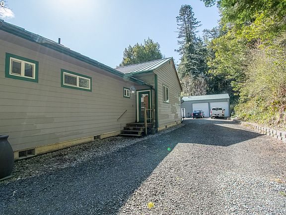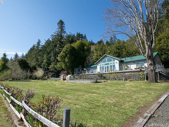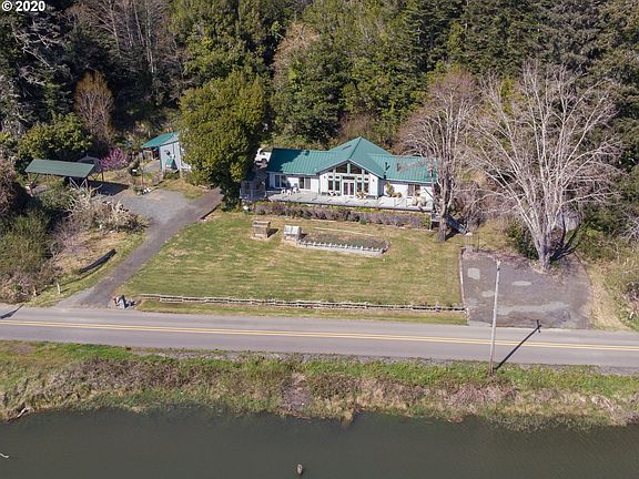 Views! 3 bedroom and 2 bath home on the Coquille River, half mile from the boat launch, 3 miles to famous Bandon Dunes Golf Resort. Great kitchen with double ovens, built in appliances, and pot filler. Custom stain glass buffet. Enjoy the river with wall of windows. All bedrooms with sliders to deck, with gazebo and BBQ. Master bath has walk in tile shower, jet tub and large closet. Cozy radiant heat floors and 2 skylights. Large 26X32 shop with bath, RV parking & dump, Greenhouse, garden beds!