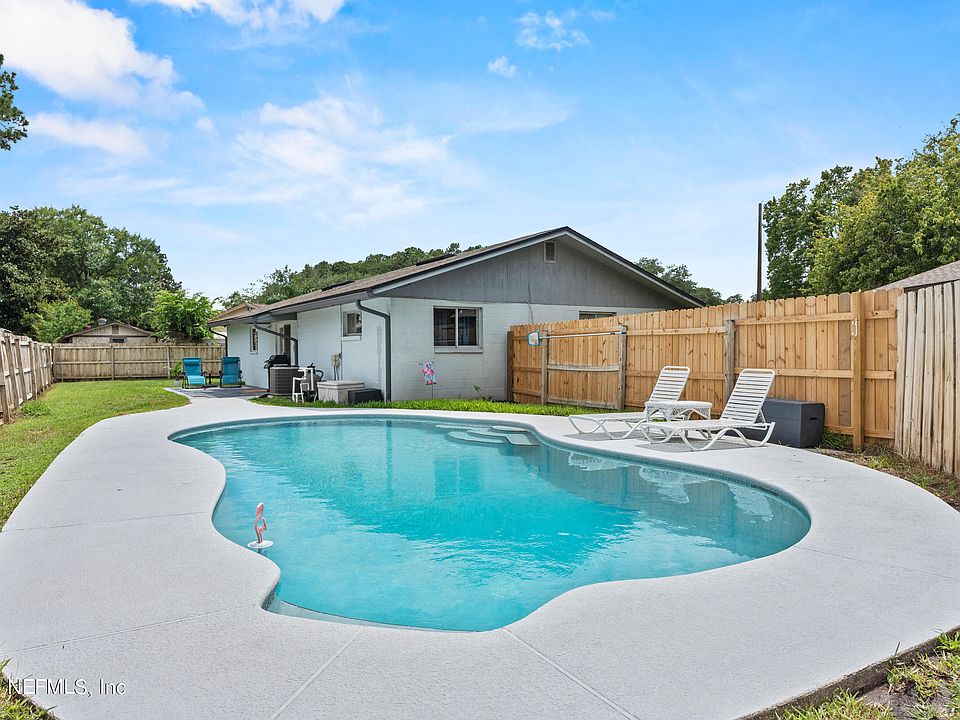 The backyard is a private oasis designed for outdoor enjoyment, featuring a patio off the dining room that leads to a beautiful pool—perfect for cooling off on hot summer days. The entire backyard is fully fenced for enhanced privacy and security.