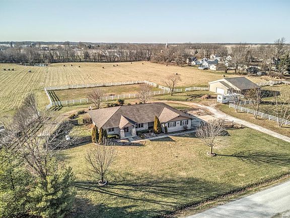 LOCATED IN PRAIRIETOWN!You don’t have to win the lottery to own a piece of paradise in the Edwardsville School District. Escape the city at this beautiful ranch home with craftsman accents in lighting,cabinets & butlers pantry sitting on 10.13 acres.A 48x36 Pole barn to house your toys and pastures offers plenty of space for privacy.The home has many upgrades including; formal DR,open great room with cathedral ceilings,first floor laundry,hardwood floors,in-home office,wet bar,oversized 27x25 two car garage,and covered patio with fire pit to entertain in the evenings. For the growing family this home features a split BR plan and master BR suite.A 1800 sqft basement with family room,full bath,2 bonus rooms,and a gas FP completes this beautifully finished space.The barn has a concrete floor, hobby room,100amp service,two-12 ft lean to's,well(no pump),and a circle drive.Paddock & riding ring has vinyl fencing.Option to purchase 8.7 additional acres(18.83 total)with MLS#19088182 to expand. Additional Rooms: Mud Room