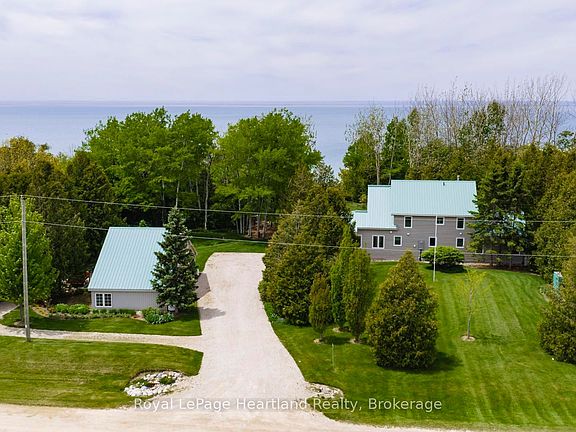 LUXURY. PRIVACY. WATERFRONT- Experience refined lakeside living in this one-of-a-kind luxury estate, gracefully set on 1.4 acres of pristine land spanning two separate lots along the shores of majestic Lake Huron. This exquisite 3-bedroom, 3-bathroom residence combines timeless elegance with modern sophistication, showcasing high-end finishes, an abundance of natural light, and an advanced geothermal heating and cooling system for ultimate year-round comfort. Designed to impress and built for effortless entertaining, the home features expansive outdoor living spaces, including a sun-drenched deck, a peaceful patio, and an upper balcony, each offering panoramic views of nature, vibrant sunsets, and the tranquil surroundings. Lush, mature trees and professionally curated gardens surround the property, complemented by a picturesque pond ready for koi fish, creating a private oasis that feels worlds away. A secondary heated outbuilding with a partial kitchen offers endless potential as a guest suite, office, fitness studio, or creative retreat. Descend the private stairway or take your golf cart down the dedicated access road to your lower lakefront lot, where serenity and seclusion await. This rare waterfront escape features two beautifully crafted bunkies and an impressive 85 feet of private sandy shoreline, a personal beach retreat perfect for hosting, relaxing, or simply soaking in the peaceful rhythm of Lake Huron. This is more than a home; it's an extraordinary lifestyle opportunity where luxury, privacy, and natural beauty converge. A true legacy property for the discerning buyer.
