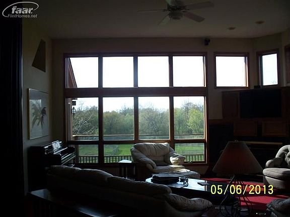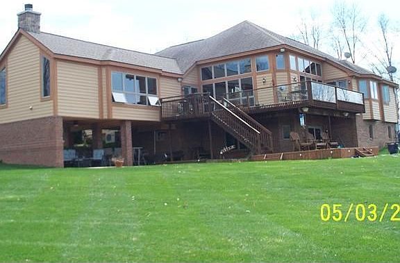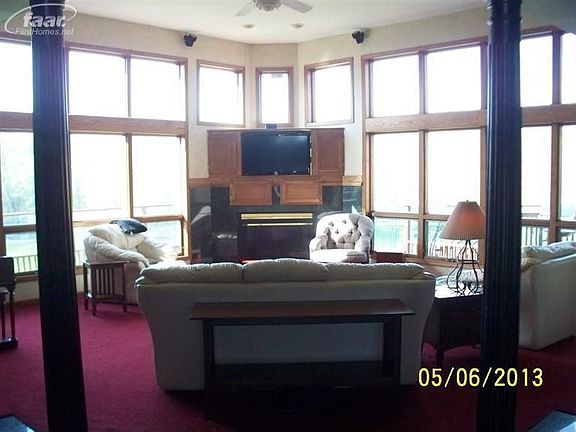 Front entry features arched ceiling leading into living rm w/spectacular walls of windows & beautiful built-in fireplace/entertainment area. Formal dining area w/ coffered ceiling. Cathedral ceilings in great room also inlaid hardwood floors, walls of windows, natural fireplace & wine bar. Cherry cabinets w/granite in kitchen plus eat in area & skylights. Master suite has bay window, coffered ceilings, whirlpool, walk-in closet & French doorway to deck. Fully finished w/o basement incl. 4th bed, 2nd kitchen, rec room, game room, full bathroom & lots of storage area. This 23+ acre parcel also inc stocked pond w/ beach area and well for pond. Yard and garden area irrigation system. 80X48 & 36X24 pole barns- one is finished w/heat & bathroom. Brokered And Advertised By: RE/MAX Grande Listing Agent: John W. Cunningham