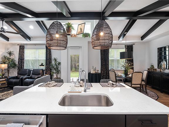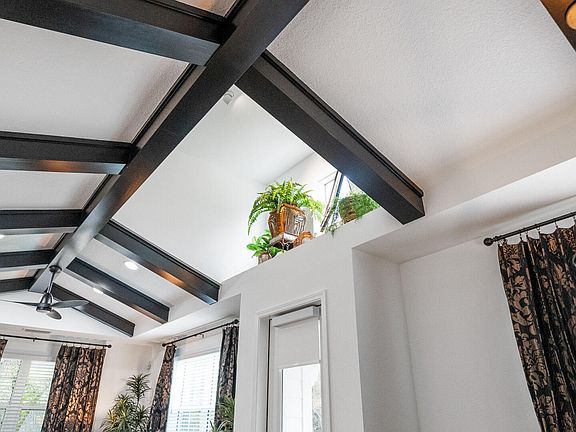 Inside, thoughtful upgrades abound. Exposed beams bring warmth and character, while custom closets ensure effortless organization. Designer lighting and upgraded vanity mirrors with built-in storage add a touch of refinement, and additional cabinetry throughout maximizes space with stylish functionality. The chef's kitchen boasts premium KitchenAid appliances, perfect for crafting island-inspired meals, while the beautiful flooring throughout enhances the home's seamless flow and sophisticated charm.