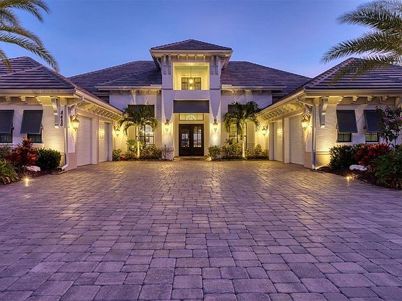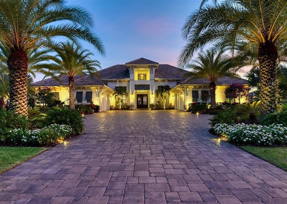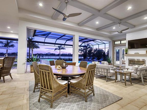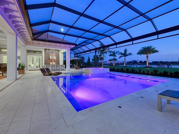 Perfectly positioned overlooking vast lake views, this pristine Stock Clairborne II model home fuses exquisite design with quality and comfort to meet all your needs. Experience indoor-outdoor living surrounded by Florida's beauty on an exceptionally ample acre homesite graced with tropical landscaping with accent lighting, an expanded driveway with built in up-lighting, and a fenced backyard. Upon entering the glass double doors, magnificent details accentuate and enhance the grandeur of the spacious open floorplan with coffered ceilings, thoughtfully placed two-story-high windows for plentiful light, and beautiful vantage points of the pool and lake beyond. The great room hosts high ceilings and is a posh delight featuring a rock wall with a linear electric fireplace flanked by built-ins with backlit lighting and decorative pendants. Sharing the space is the gourmet kitchen showcasing breathtaking two-tone cabinetry with under-cabinet lighting, granite countertops, marble subway tile backsplash, cleverly hidden walk-in pantry, a gas cooktop and stainless appliances. Adjacent is a formal dining room that is a wonderful area for upscale entertaining with a dry bar and wine cooler for evening refreshments. There is a sophisticated office with water views for serene, remote working as well as a versatile media room which can easily host guests or be fashioned as a gym, home theatre, game room or whatever suits your lifestyle. Three incredibly sized additional bedrooms provide quiet domains for the family, 2 of the guest bedrooms feature en-suite bathrooms, while the remaining back guest bedroom is large enough to be a bonus or club room with adjacent pool access bathroom. Your privacy is obtained in the master suite boasting a peaceful sitting area, substantial walk in closets and spa-like en-suite bath including dual vanities, a freestanding soaking tub and a large walk-in shower. The true hub of the home is the outdoor space, crafted for living, dining and making memories while cooking in the fully equipped outdoor kitchen with bar seating, swimming year-round in the high-end pool and spa, watching TV by the cozy fireplace beneath the lounging space with beamed ceiling, while you enjoy the panoramic, open pool screen overlooking the peaceful lake. Or decide to play with the kids or pets in the massive, fenced backyard with seating areas looking out over the water. This is more than a home, it's a haven. Even better is the location within the secure and prestigious Concession Golf Club and Residences right outside of desirable Lakewood Ranch.