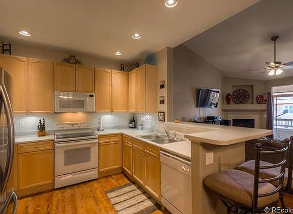 Fantastic 2 Bed 2 Bath Penthouse Unit with a 1 detached garage in Redstone Ridge. This top-level unit offers fresh paint, an open floor plan with vaulted ceilings, 42 kitchen cabinets, and a spacious family room with a gas fireplace wrapped with decorative tile. For your bedrooms, you have a large primary bedroom & bathroom with double vanities and a large 2nd bedroom with crown molding located on the opposite side of the unit next to the 2nd bathroom which is ideal for a roommate. In addition, this unit has laminate floors, a separate laundry room, a private balcony with southern views, and it is located within walking distance to a grocery store, restaurants, shops, recreation, and easy access to c-470. Lastly, no waiting to move in as you can move in immediately after closing!