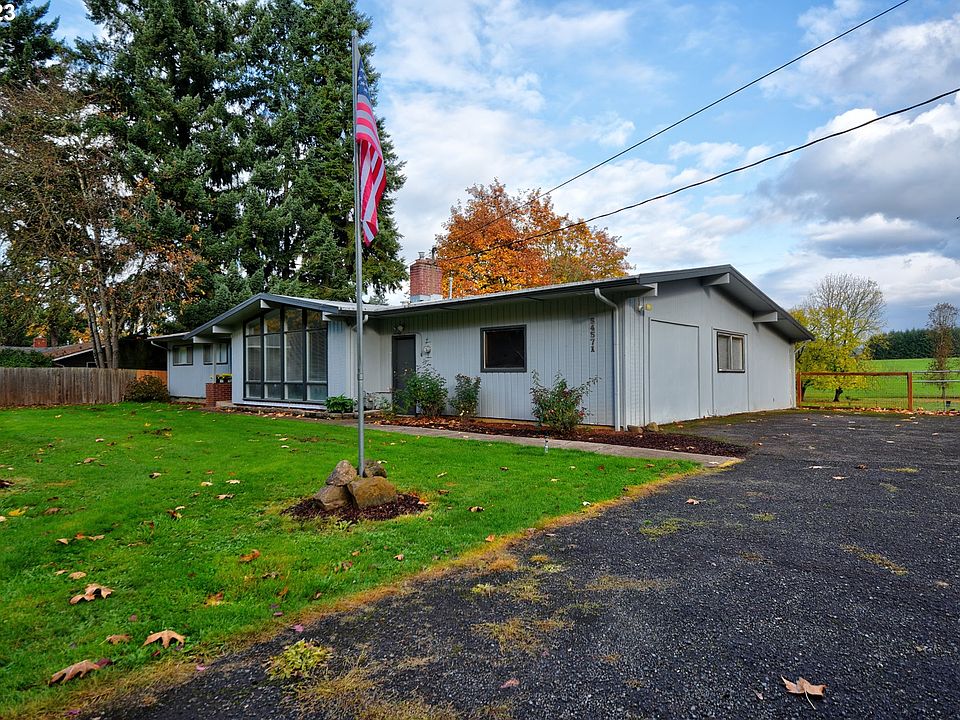 New carpets NOV 2023 and a stellar price reduction! Close-in Pleasant Hill 3BR/1.5BA single-level, traditional ranch on a generous .75 acre lot. So much welcoming country light in every room. A wall of windows brightens the living room and the modern gas fireplace provides instant coziness. You will enjoy both a family room AND extensive bonus space that offers many options for use: craft space, storage room, tool/workshop area, or additional living room. Bedrooms have updated laminate floors and the kitchen area is perfect for gathering friends & family (there are even 2 ovens). Plus everybody loves air conditioning! The backyard is perfect to enjoy the farmland view from your covered back patio, with space to build a terrific shop/barn or create a garden bounty. The property is fenced with excellent sound barrier to Parkway Rd. There is a booth to catch a school bus (or holding your Amazon packages), plus several outdoor storage areas and an enclosed shed. The expansive driveway allows for RV parking and easy in/out for several cars and can easily be extended into the back half of the property. You are minutes from services in Pleasant Hill and a short commute on I5 to Eugene or through Jasper into Springfield.