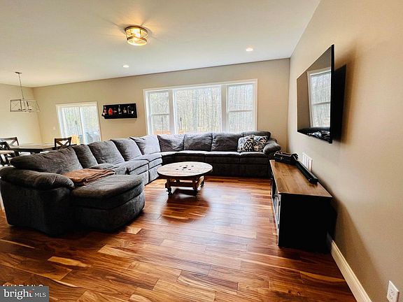 This modern home features an open floor plan with a spacious living room, dining area, and kitchen. The kitchen has modern appliances, stainless steel refrigerator, oven, and dw, as well as granite countertops and a kitchen island. The living room has large windows that let in natural light and offer views of the woods. This room also features 4 BR, three baths and newly renovated basement.