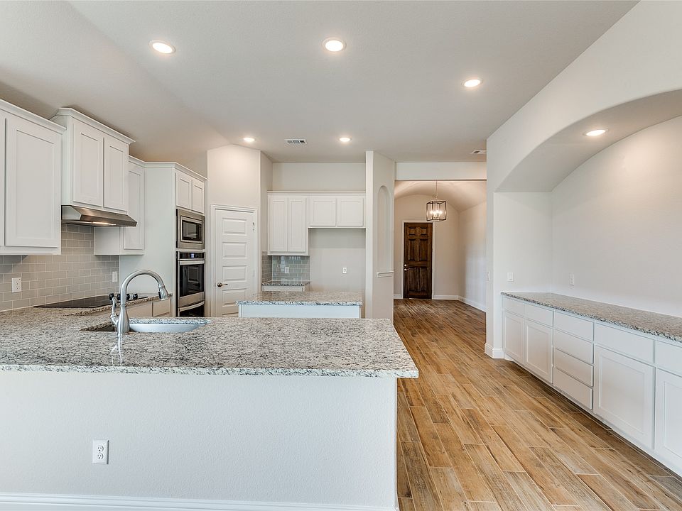 The home greets you with an impressive 8 foot front door, hinting at the elegance that lies within. In the kitchen, you'll find the convenience of double ovens, perfect for cooking and baking to your heart's content. An oversized 2 car garage provides ample space for vehicles and storage needs. The living room is anchored by a striking stone fireplace, creating a cozy and inviting atmosphere. Step outside to the expansive covered patio, offering a great space for outdoor entertainment and relaxation.