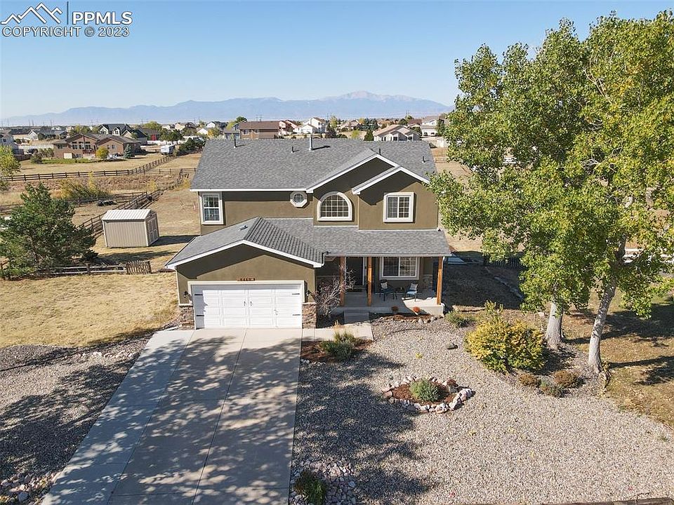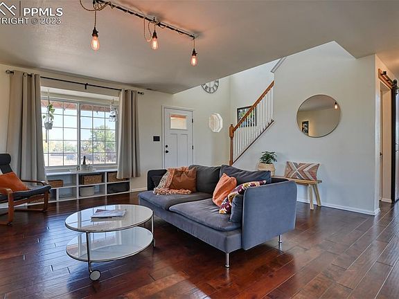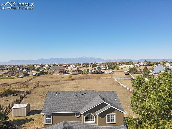This absolutely stunning home is situated on 1.25 acres and features beautiful views of Pikes Peak and the front range! When you walk in the front door you'll immediately notice the thoughtful & charming upgrades located throughout the home. The main level features lovely engineered hardwood floors and thanks to a multitude of windows is bright and sunny throughout. The fully remodeled kitchen is a real showpiece and includes a gas stove, stunning leathered granite, stainless appliances, updated cabinetry and it flows seamlessly between the living room, dining area and family room. The family room is another showpiece ~ open and airy with several windows it features a soaring ceiling, gas fireplace and sliding glass door access to the large 18x18 ft deck. The upper level layout includes the master bedroom, remodeled hall bathroom and fully remodeled 5 piece master bathroom. The walk out basement includes a large rec room, bedroom with attached (and fully remodeled) 3/4 bathroom & storage in the utility room. I can't say enough about this fabulous home, it was designed and remodeled like a home that should be featured in a magazine. Add to that killer mountain views, RV parking (with plenty of space to turn around) additional parking spaces in the front, landscaped front yard, fire pit area, 10x12 storage shed, fenced back yard (again...1.25 acres!) covered front patio, stucco exterior, updated light fixtures, vaulted ceilings in every upper level bedroom and you have everything you need to move right in and begin enjoying this beautiful property. Metro district dues cover access to 2 community centers. The community center West is about a 1-2 minute walk from the house & includes an outdoor pool, sand volleyball, playground & fitness center. The East recreation center features a indoor pool, fitness center and basketball court. Homes in this area don't come on the market very often, don't wait to make your move!