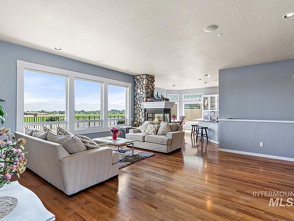 Stunning 5 bed 3 bath south Boise home with magnificent views of Bogus Basin and the Boise foothills! Spacious home featuring a large great room with fireplace, Open kitchen with breakfast bar, master suite with an attached office/nursery or guest suite on the main level. Master Suite has direct patio access, dual vanities, jetted tub with fireplace and a huge walk-in closet. Downstairs offers a large bonus room with built in bar, office space, two additional bedrooms and huge storage closets. Bright interior with walls of windows offering plenty of natural light. Enjoy summer nights on the back patio overlooking the crisp flowing waters of the New York Canal with lush acreage below and breathtaking views of the valley.