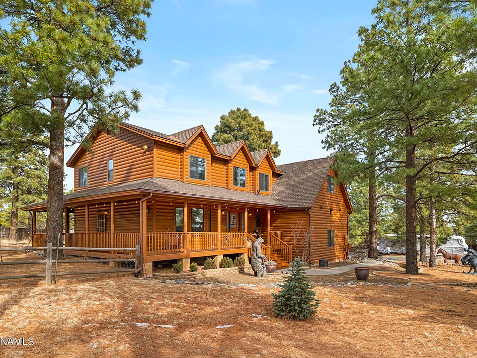 Welcome to this luxury cabin BACKING FOREST! Meticulously cared for, pride of ownership shines through this stunning log sided home. This home is perfect for entertaining. Impress guests with vaulted tongue and groove ceilings, surround sound, fireplace, in floor heat and wrap around porch. Culinary enthusiasts will indulge in the gourmet kitchen equipped with a subzero fridge, thermador grill & griddle, hickory cabinets, 2 islands, pot filler, solid granite apron sink and much more. Appreciate the fine details from grand chandeliers, etched glass, log accents, tinted windows and solid wood doors. Enjoy the peacefulness of backing forest on two sides. Ability to park and dump your RV. 40x40 + garage with attic, water and power. HVAC medical grade air purifier and air conditioning.