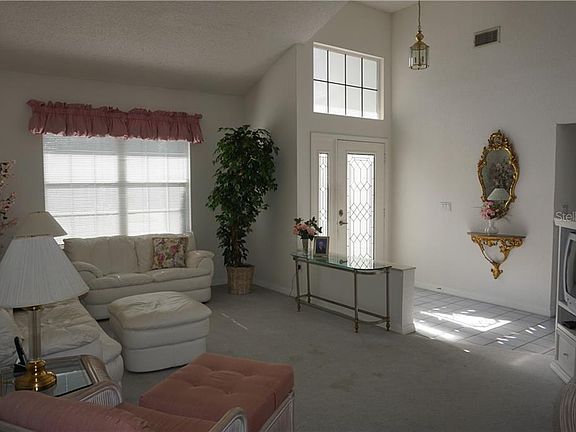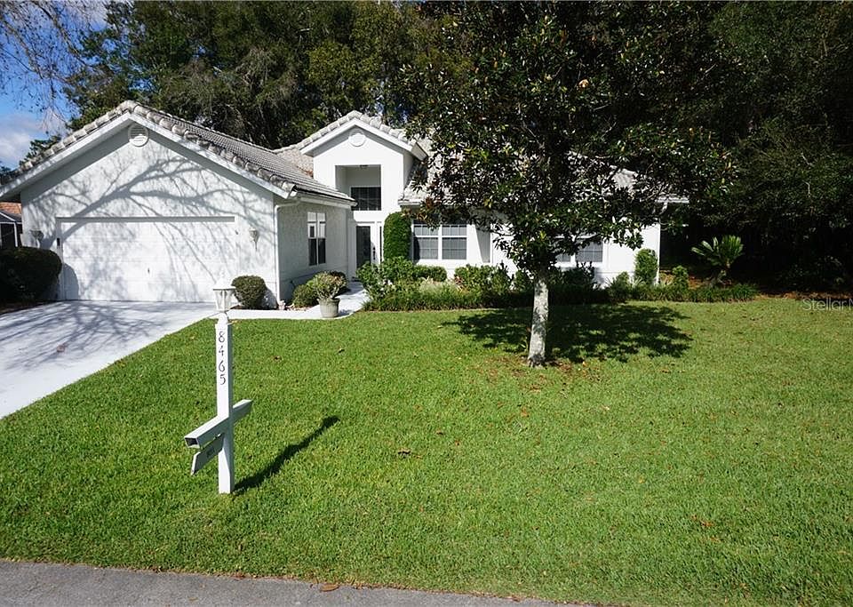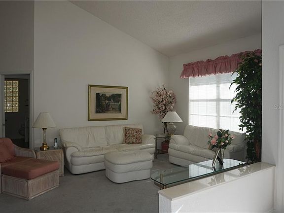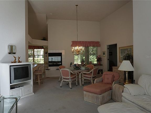 A Classic Seville Model that has been modified to include a bonus room/sitting room off of the Master Bedroom. Upon entry your eyes take in the high ceilings and the open and bright living room and dining room with a fireplace. There is a den/office off of the dining room with a view to the lanai and backyard. This home has alot of privacy in back and the view from the kitchen and lanai is serene and country like. French doors lead to a Huge king size master bedroom with on suite bathroom that includes step in shower, double vanities and soaking tub. King size guest room makes your guests feel special with a pocket door that closes off the bedroom and bathroom for total privacy. Kitchen has tons of counter space and cupboards and is open to a breakfast area with more cabinetry. Off of the kitchen is the screened lanai that affords you the total Florida lifestyle. Big 528 sq foot garage with built in cabinetry. AC and hot water heater replaced in 2019. Home is located right around the corner from the indoor pool. Community offers 6 pools, 5 hot tubs, 2 fitness centers, GOLF COURSE, Restaurant, pickleball, tennis courts, bocce ball, shuffleboard, volleyball courts, library, billiards room, card room, craft room and over 100 clubs. So come be a kid again!