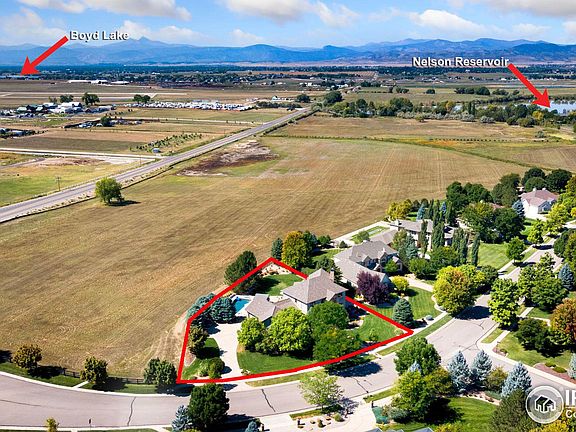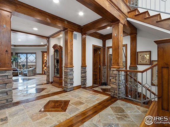 Nestled on over half an acre in the premier Eagle Ranch Estates, this custom luxury home offers an unparalleled living experience, backing onto 100 acres of protected Conservation Easement with views of Longs Peak and the front range. With fresh paint alongside numerous updates, the home's allure is immediately apparent. Inside, the spacious open floor plan is accentuated by European-influenced architecture, showcasing a blend of tumbled Travertine and African mahogany flooring. Impeccable interior designs and quality finishes are evident throughout, from hand-troweled walls to large picture windows that frame the breathtaking scenery. The massive kitchen is equipped with numerous built-ins, stainless appliances, Australian granite counters, and a recently updated industrial vent. Adjacent to the kitchen, the formal dining room provides an elegant space for gatherings, while the family room, complete with a stone fireplace and a wet bar, invites relaxation and entertainment. A dedicated office offers the ideal space for remote work or creative pursuits. The upper level features a private haven with 4 bedrooms, each with its own private bathroom access. The primary suite wing is a testament to luxury, acting as a private paradise complete with a seating area w/ a stone fireplace, a spa-like bath w/ a jacuzzi, and a walk-in closet. The walk-out basement extends the living space further, featuring a recreational area with a large bar and a stone fireplace. An additional bed and bath offer flexibility for accommodating guests. Outside, the fenced yard is your ultimate entertainment zone, featuring a large patio area with a pergola and dining area. The saltwater pool has a mechanical cover and an adjustable high-capacity, gas-powered water heater with plenty of space for lounging and sunbathing. The main garage bay is prewired for 240v 60-amp fast EV charger installation. Residents enjoy amenities such as tennis, pickleball, and lakes for paddleboarding and fishing.