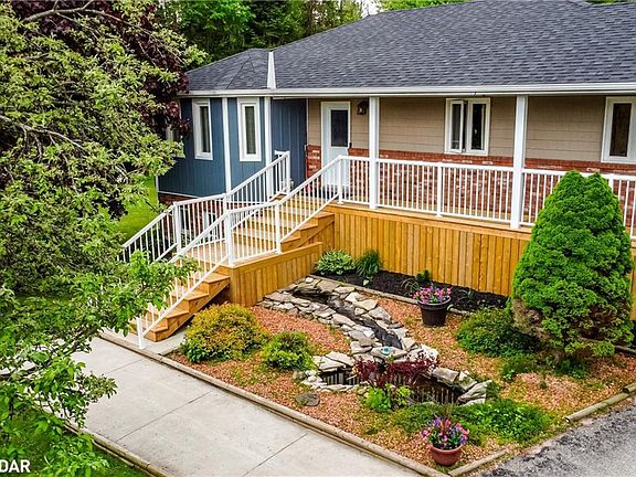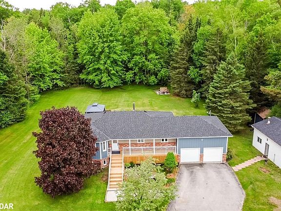 Customized bungalow with attached dble garage and separate workshop privately nestled on level private tree-lined 200 x 250 lot (just over an acre), in Utopia. Well kept 3 bedroom home with spacious living dining and kitchen area with hardwood and ceramic flooring, walk out to large tiered deck and gazebo with private deck off primary bedroom Finished lower level with large family room with bar/entertainment area and fireplace. 4th bedroom and newly finished 3 piece bathroom. The outbuilding/workshop is approx 740 sq. ft. heated with 10 ft ceilings, insulated, dry-walled, serviced and 2 thick dense foam flooring and shingles replaced 2020. Propane tank is a rental and services the fireplace and barbecue only, app $95 annually. The house is heated FAOil with the oil tank being 5 yrs old. Shingles on house 2022, Sump pump, pressure tank, water softener, owned HWT, Furnace, Air Conditioner all replaced in 2024. Jet pump for drilled well 2023. Lovely solid home and workshop and lots of room with endless possibilities with good hwy access with short drive to Barrie, Angus Cookstown etc.