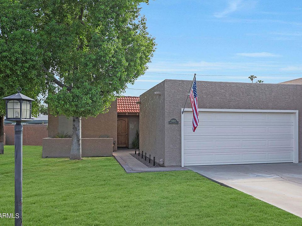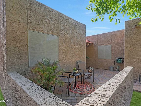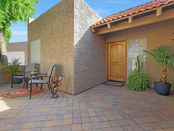 Nestled in the highly desirable Santa Maria Villas, this charming single-story home offers comfort and style in a peaceful community of just 25 patio homes on a picturesque, tree-lined street. This well-maintained 2-bedroom, 2-bath property has the rare benefit of only one shared wall, providing added privacy. Enjoy a spacious great room with a cozy beehive fireplace, a well-appointed kitchen with granite countertops, stainless steel appliances, and a wet bar with a beverage cooler—perfect for entertaining. The large backyard is a serene retreat with a covered patio, pavers, and beautifully designed desert landscaping. With a two-car garage, split floor plan, and prime location near the 101 and Old Town Scottsdale, this home combines convenience with Scottsdale charm. Don't miss this gem!