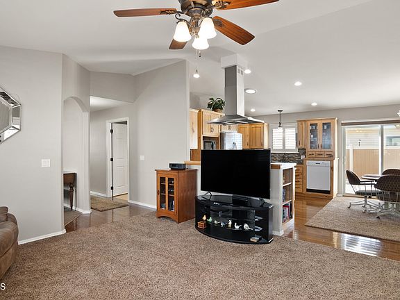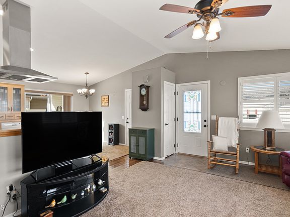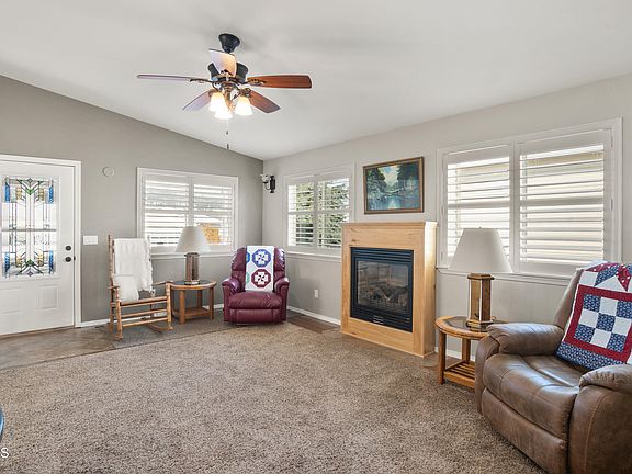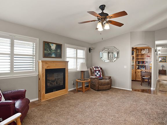 Warm and inviting home in this desirable 55+ community. Enjoy one-level living with 2 bedrooms plus office/bonus room, 2 bath. Luxurious wood floors throughout. Kitchen with custom hickory cabinets & center island. New handcrafted hickory book shelves & cabinets in the office. Spacious primary suite with private bath. Laundry has a large countertop work surface and new custom hickory cabinets with pull-outs. Wood blinds. All appliances plus washer & dryer. Generously sized attached garage features additional storage space. Low maintenance landscaping. Fully fenced backyard offers privacy. Covered back patio with automated awning. Storage shed. New Rinnai water heater. Roof just treated w/MAX life extender. No rear neighbors. Gorgeous mountain views! This amazing neighborhood offers many amenities; large clubhouse, indoor pool, sauna, craft area, billiards, gym, library, 9 hole chipping green, horseshoes, pickleball & more. Wonderful neighbors in an active and inspiring community.