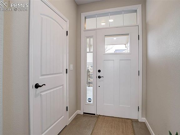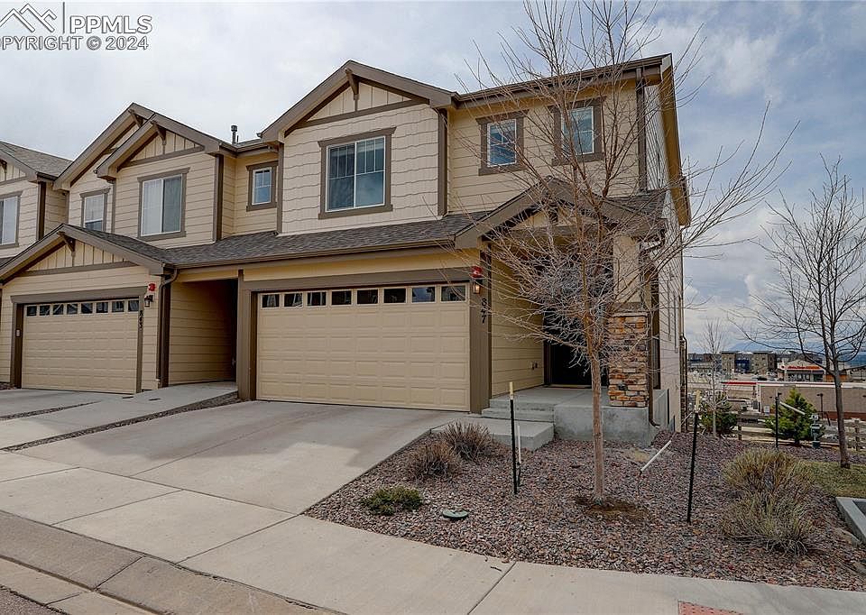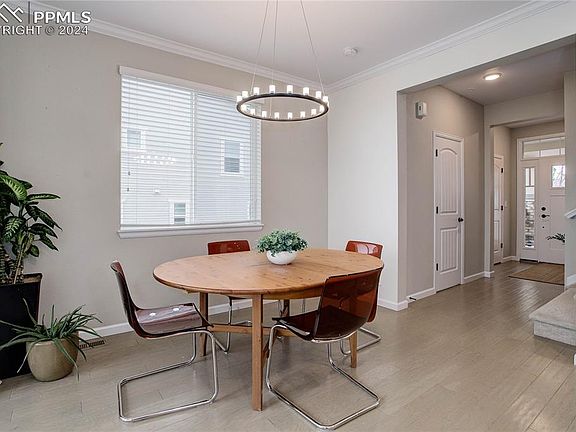 Charming end-unit townhome at Jackson Creek combining functionality and comfort! The living room boasts vaulted ceilings and stunning views of Pikes Peak, providing a serene backdrop for relaxation. Dine in comfort no matter the weather in the dining room with a chandelier or walk out to the covered deck, perfect for enjoying al fresco dining. Enjoy cooking in style in this modern kitchen featuring an island, quartz countertops, stainless steel appliances, and crown molding for a touch of sophistication. A powder room with a pedestal sink adds convenience for visitors. The primary suite is a peaceful retreat, complete with a 9x5 sitting area, a picture window framing Pikes Peak, and a spacious walk-in closet. The en-bath offers indulgence with a spa shower and a dual sink vanity. Two additional bedrooms, each with a walk-in closet and plush carpeting, provide ample space for family or guests, while a full bath accommodates their needs. The laundry room features built-in shelving for added organization. The unfinished basement holds great potential and offers a walk-out to a covered patio. With a 2-car garage conveniently located on the main level, this home offers unobstructed views of the Air Force Academy and mountains, along with easy access to the nearby Jackson Creek Parkway shopping center and natural open space, making it an exceptional find in the area. Don't miss the opportunity to make this your new home sweet home!