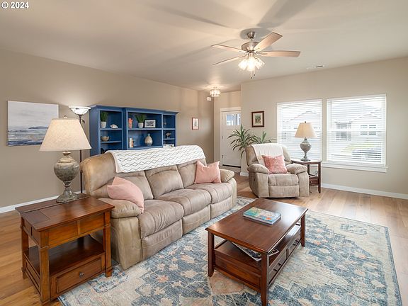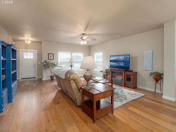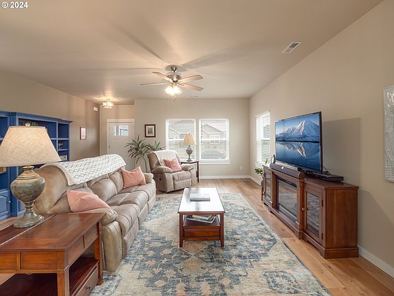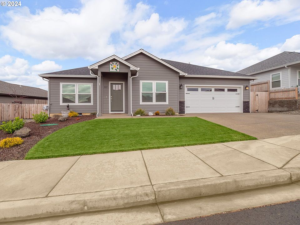 Welcome to your next home! This meticulously maintained residence surpasses expectations. The open floor plan, adorned with wood floors, seamlessly integrates spacious living areas. From the front door, you're immediately invited into the heart of the home.The modern kitchen, with quartz countertops and an island bar, is a culinary haven with a nice pantry too. The primary suite is a retreat with a large walk-in closet and a luxurious bathroom with double sinks, quartz counter & tile floor. High ceilings in all rooms add to the spacious feel. You'll find tile flooring & quartz countertop in the guest bathroom as well! Don't miss both good-sized guest bedrooms or they could be used for den/hobby space. The tile-floored laundry room connects the home to the attached garage with automatic door & access to the fenced backyard. Step outside the patio door off the dining room to a fully landscaped backyard with turf! The patio and covered patio areas are great for outdoor entertaining or relaxing. You will enjoy surrounding mountain views, adding to the picturesque setting.This home is situated in a neighborhood of new & newer homes. It's near Oak Hills Golf Club and just minutes to I-5--offering both luxury and convenience! Looking for a great place to take in the Northwest atmosphere? Nearby Ford's Pond provides outdoor activities, fishing, and exercise options along its 2 mile paved loop & nature trails. Don't miss the chance to make this impeccable home yours-- a haven of comfort, style, and NW living!