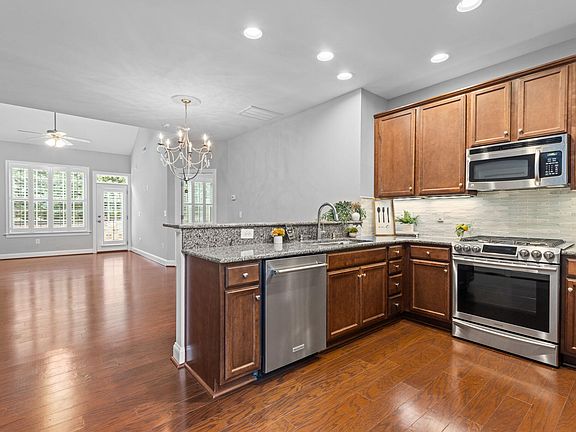 Get ready to swoon over this beautifully updated 3 bed, 2.5 bath townhome that lives large! Complete with a two-car garage and an inviting loft area, it boasts engineered hardwoods, plantation shutters throughout, soaring entryway ceilings, and a dreamy kitchen with a gas range, stainless steel appliances, and a pantry. The first-floor primary bedroom offers both convenience and luxury with a renovated en-suite bathroom featuring a walk-in shower and a HUGE custom-designed closet! First floor laundry with washer & dryer to convey. Upstairs, two large bedrooms share a well-appointed bathroom. Walk to the neighborhood lake and popular shopping/dining including Target, Chick-fil-A, Whole Foods and more. With convenient access to I-540, you are just a short distance to popular Raleigh destinations like RDU Airport, RTP, North Hills, Crabtree & more making this home the ideal location to call home!