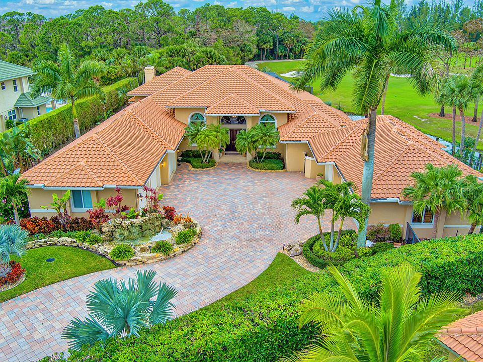 Welcome to 8472 Ironhorse Court situated on the 4th hole of The Preserve, a non-mandatory Club with three levels of membership available to prospective new homeowners. Originally built in 1995 by Alps Custom Homes, this home has been renovated and updated over the years. Sitting on .54 acres and adjacent to the 32,000 acre Grassy Waters Preserve, this home has the best of both worlds with golf course views and the privacy offered by the wetlands. You enter the lushly landscaped estate size property passing a waterfall feature into the brick paver courtyard where there are 4 garages. The main house is 4 bedrooms/4.5 baths and 4,342 SF of living space and a separate/detached guest quarters of 945 SF. Entering the front door, you notice the grand foyer with soaring 16' ceilings flanked on each side by a columned dining room and private office with Cherry builtins. The main living areas feature coquina tile floors on the diagonal. The large living room has floor to ceiling windows allowing in the natural light. The kitchen has been masterfully redesigned with a huge island, hidden storage areas, Wolf gas stove, Sub-Zero refrigerator and Miele dishwasher. Off the kitchen is a comfortable den with coquina encased wood burning fireplace as well as a wet bar. The split bedroom floor plan has 3 bedrooms on one side of the house while the other side has the impressive master suite featuring three closets in all, two being walkins. The master bath is grand with two totally separate vanity areas, glassed in shower and spa tub as well as separate water closet. The back of the house features a screened in Summer kitchen with fridge and grill, full cabana bath, three covered seating areas and lovely pool and spa all surrounded by tumbled marble floors all making for a truly great entertaining home. In addition to the 4 bedrooms in the main house, there is also a fantastic detached guest or inlaw quarters with French cut tile floors with a bedroom, bath, dining room, full kitchen, office and living room with a nice seating area overlooking the 4th hole fairway.