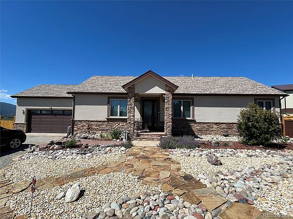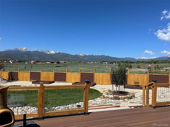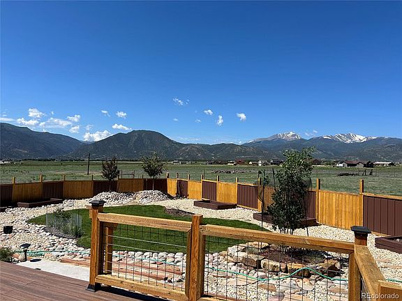 Meticulously cared for property on 2 acres with stunning mountain views of Ouray and Chipeta peaks, located just 5 minutes to Poncha Springs and 10 minutes to downtown Salida. Only two owners. This fairly newly constructed property has had many upgrades since the current owners purchased including: fully landscaped backyard with crab apple, aspen maple, pine and Hawthorne trees, raised beds, drip brass irrigation system, wood deck, new fencing, guttering, central A/C, central humidifier, automatic blinds that operate on a remote control "Pebble system" and a Simply Safe Security System. This home boasts of beautiful marble countertops in kitchen and bathrooms, sunny and open kitchen, dining and living room area, primary suite with a five piece bathroom (water closet, soaking tub, double vanity and step-in tiled shower), two equal sized guest bedrooms (or office) with a full bathroom in between, laundry room and 2 car attached insulated garage with gas wall heater and cement flooring. This property also has a reverse osmosis water filter system, ceiling fans, water softener, radon mitigation system, and a buried 500 gallon propane tank. Septic was pumped and inspected just 2 1/2 years ago. And that is not all! The well has an augmentation that allows for watering all trees and plants outside of the home. Flagstone paths, wood and metal fencing, ample parking spaces, cistern for catching rain water and and upgrade on garage door. This is a must see!