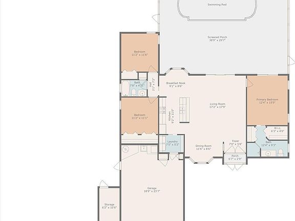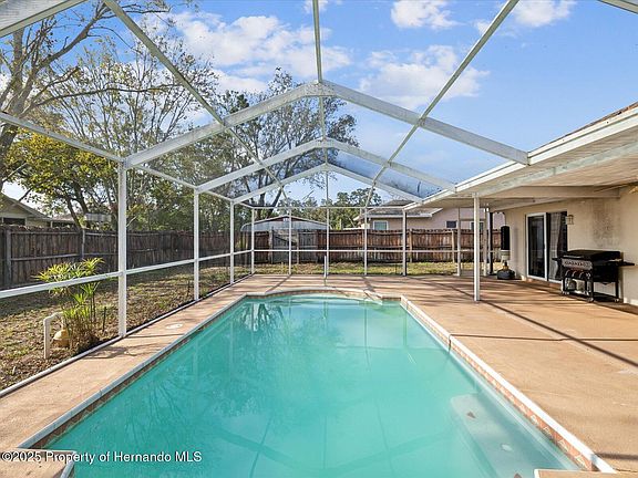 Nestled in a serene neighborhood, this charming 3-bedroom, 2-bathroom, 2-car garage, single-family home offers the perfect blend of comfort and functionality. Boasting a split floor plan, the layout ensures privacy for the primary suite while maintaining a seamless flow for family living and entertaining. Elevated ceilings enhance the spacious feel, filling the home with an abundance of natural light. The heart of the home is the open concept living area, where the kitchen, breakfast nook, living, and dining rooms unite effortlessly. The kitchen features ample counter space, modern appliances, and a convenient breakfast bar, ideal for casual meals or entertaining guests. Windows and sliding doors from the kitchen, living room, and primary bedroom overlook the backyard oasis, providing a picturesque view. Step outside to the screened lanai, where you'll find a sparkling pool, perfect for cooling off on warm days or hosting summer gatherings. The fully fenced yard offers privacy and plenty of space for pets or outdoor activities, creating a personal retreat right in your backyard with a 6'x10' storage shed. The primary suite serves as a tranquil escape, complete with a walk-in closet, a wall closet, and an ensuite bathroom featuring a corner standing shower. Two additional bedrooms share a well-appointed second bathroom, providing flexibility for family, guests, or a home office. Roof 2016. Conveniently located near schools, shopping, and dining, this home combines style, comfort, and practicality.