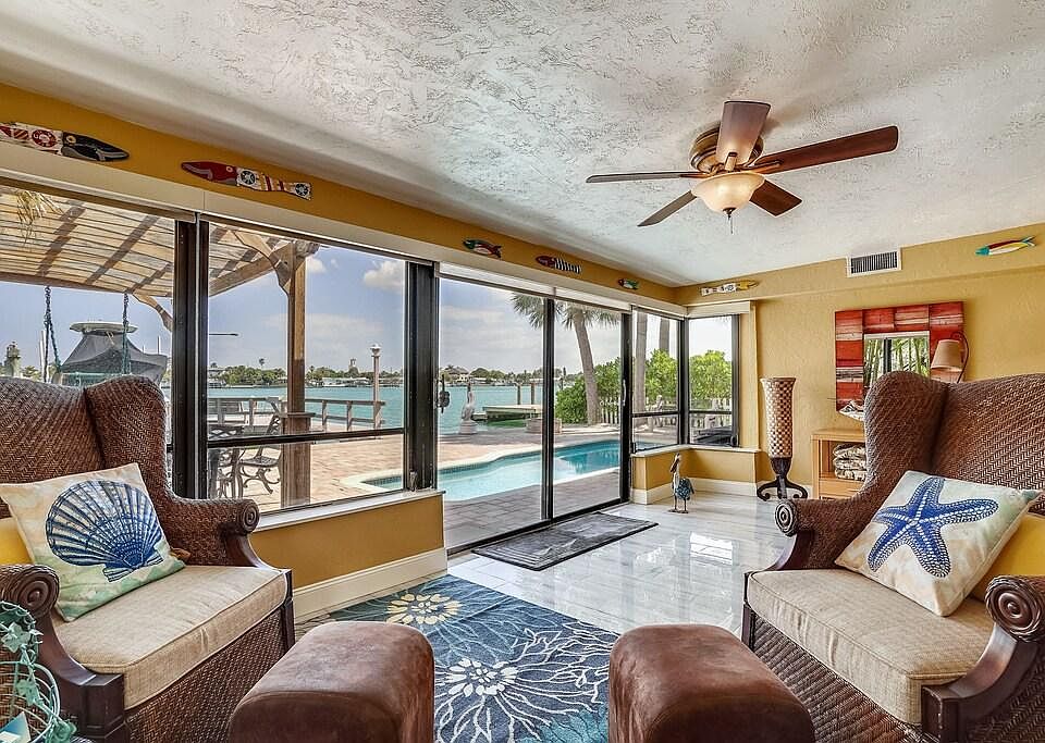 The Manatee Home, recently remodeled, is a spacious waterfront home with a private pool located in the popular Sunset Beach neighborhood of Treasure Island. Your family will fall in love with the recent updates including a fully remodeled kitchen as well as fresh paint, flooring and furnishings throughout the entire home. The pool and patio are located on the bank of the Intracoastal Waterway (Boca Ciega Bay), along with a fishing dock for your use. You have a great view of water activities and wild life as you relax by the pool - heating is optional. Plus, if you want to go to the beach, it is less than 1-block away. This home features an open floor plan. The open kitchen is fully equipped, washer/dryer, 2-car garage, free Internet access and 3 TV's will make your vacation even better. This is a perfect spot for a beach getaway. The security deposit is refunded in full upon vacating the premises provided the condo is in good condition after a brief inspection. NO SMOKING