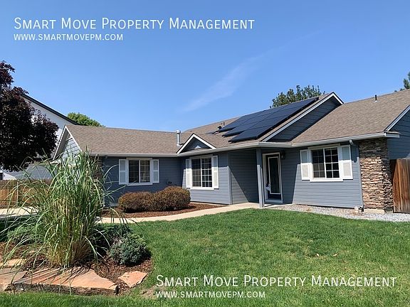 Coveted single-level living with 3 bedrooms plus a flexible office/den. Great location close to dog park, restaurants, shopping and more. Nestled on a generous corner lot. Split bedroom floor plan. The warm and inviting living area features vaulted ceilings and a cozy gas fireplace. Laminate flooring throughout. Kitchen features breakfast bar and pantry. Master suite has soaker garden tub and walk in closet. Solar power. Washer/dryer hookups. Fully fenced backyard with covered patio, firepit, RV-access parking and two sheds. TERMS: Rent: $2300 Security Deposit Refundable OAC: $2300 Leasing Administrative Charge: $150 Lease Term: 12 months Application Processing: $45 per adult Pets: Max 2 pets negotiable. Pets under one year of age will not be considered. Pet Rent: TBD ($35-$45 per pet/mo) Pet Acceptance Charge: TBD Utilities Paid By Tenant: All utilities Lawn maintenance: Tenant Roommates: Max 3 Renters Insurance required Resident Benefits Package required with ALL lease agreements under Smart Move Property Management. The $35 monthly bundle includes: Renters Insurance - $20k personal content plus $100k liability, Credit Reporting for Rent Payments, Pest Control, Furnace Filter Home Delivery, Bi-Annual Repairman Visit, 24/7 Emergency Live Answer call line, Resident Portal. Schools (subject to verification by applicant): Borah High School, West Jr High, Horizon Elementary Property listing information is deemed reliable but not guaranteed. Applicant is to verify all information.