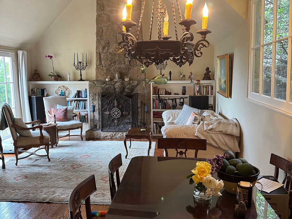Beautiful furnished summer sublet June 15-Sept 15. Located in Mission Cyn, this charming home has 2 bedrooms plus another nook sleeping area and a full bath, PLUS a charming detached studio on the lower level with a double bed and a half bath with an outdoor private shower. House has some AC in some of the rooms and the studio does as well. Bedroom 1: queen bed and closet. Bedroom 2: queen bed and closet; there is a nook for a twin day bed. Bedroom 3: detached Studio has a double bed. Sleeps 6. Nice views, fenced in yard, private, quiet neighborhood. Patio with BBQ and a fire table. washer and dryer. There is a covered outdoor deck with a large dining table and chairs for entertaining. There is an orchard with many fruit trees including avocados, lemons, limes, grapefruit and oranges. There are a flight of stairs to the house and down to the studio. Fully furnished. $3900 per month includes utilities. 3 month lease. will allow one small dog Available June 15, 2025 thru Sept 15-2025. Three month lease. we will cover utilities. You must be water saving conscious.