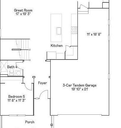 kitchen with a large eat in kitchen island, quartz countertop and a 2-story great room. Open railing leading to the upstairs